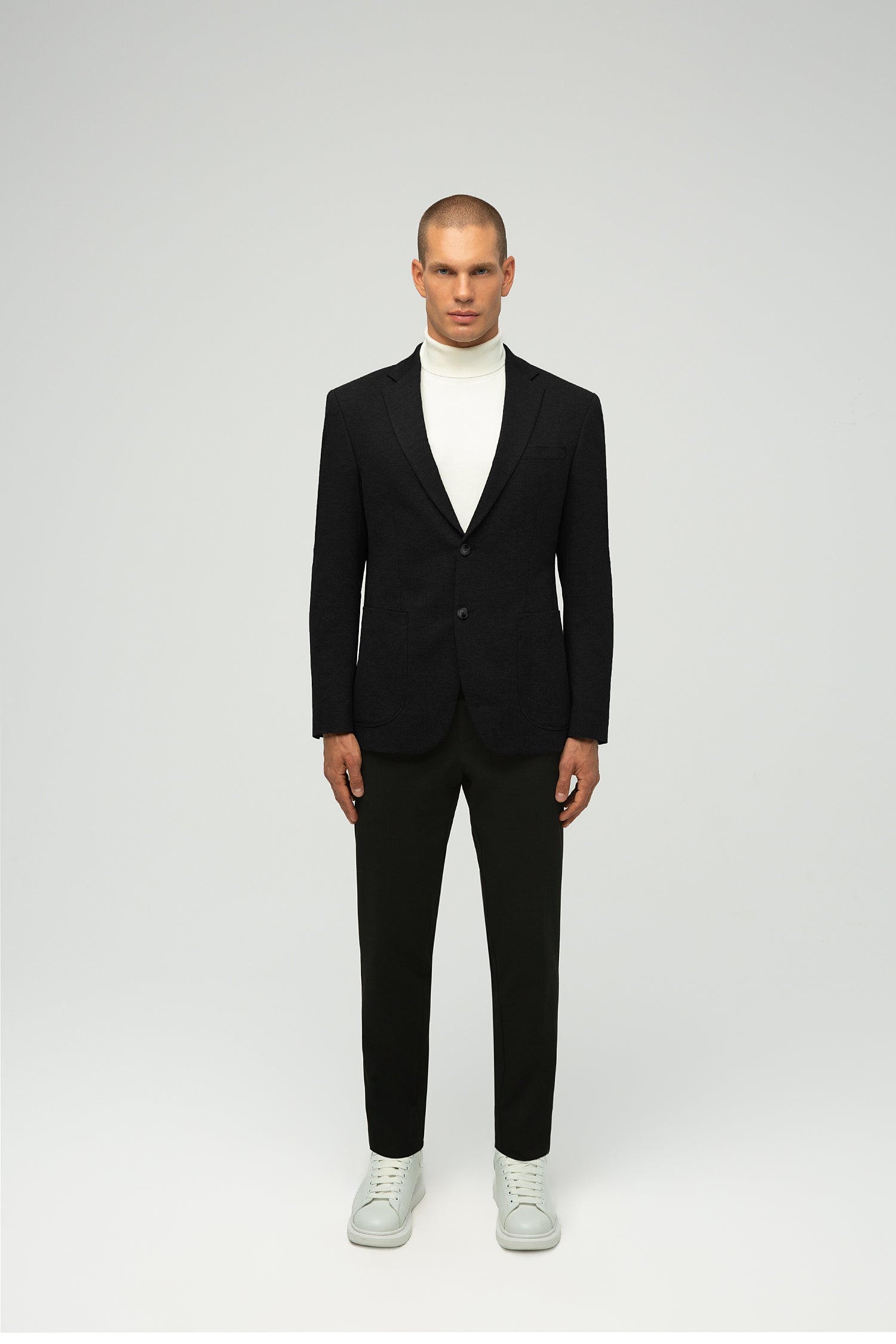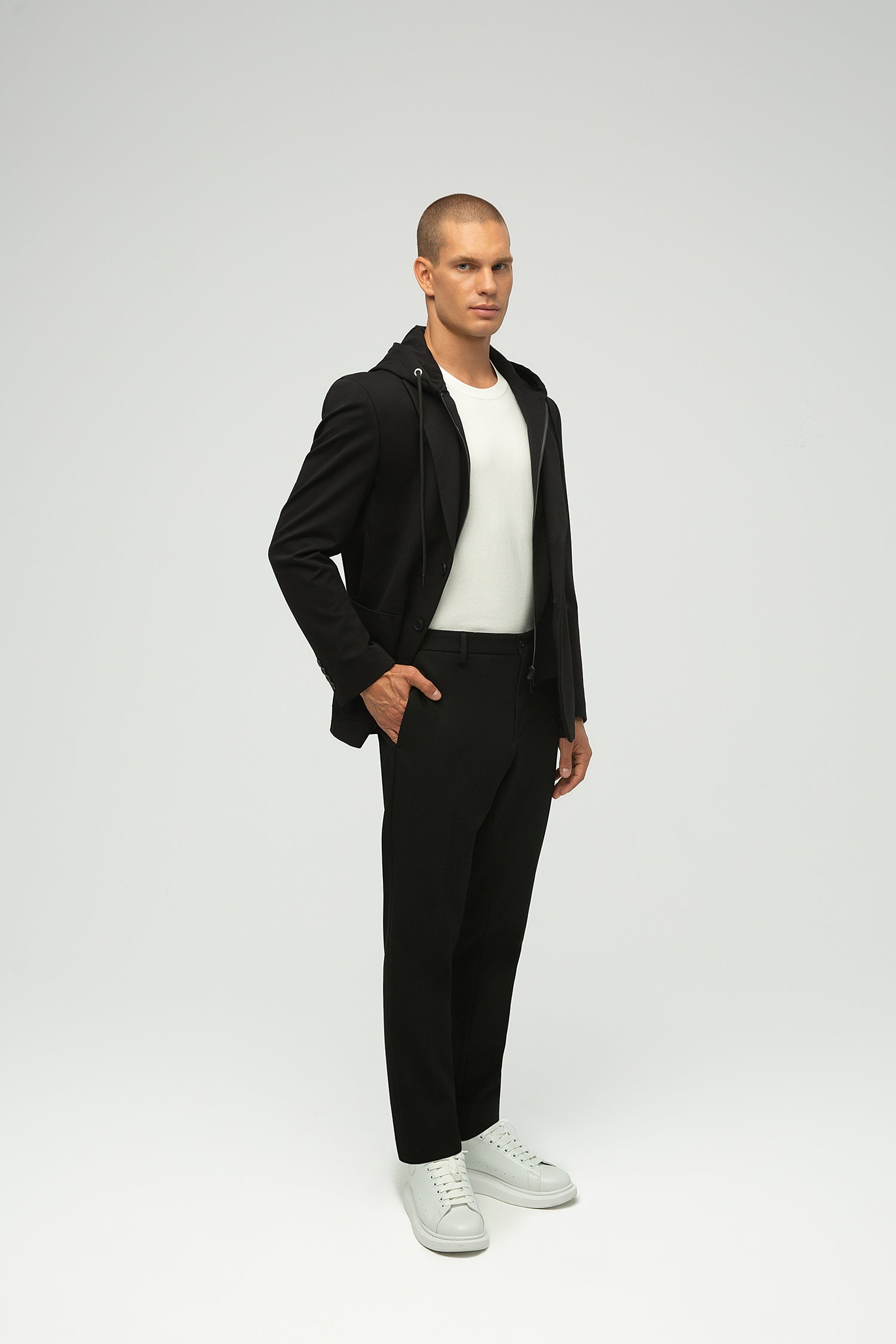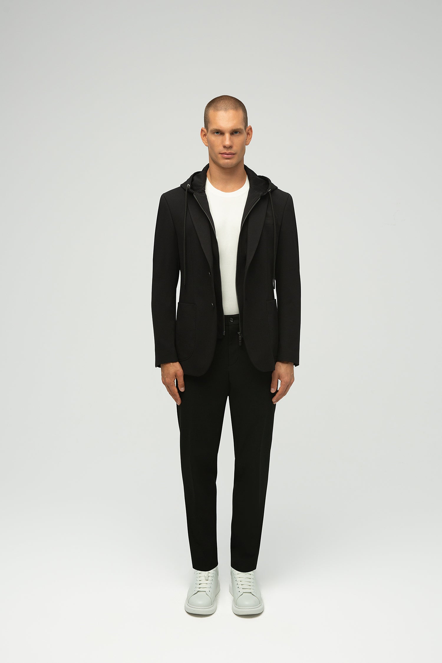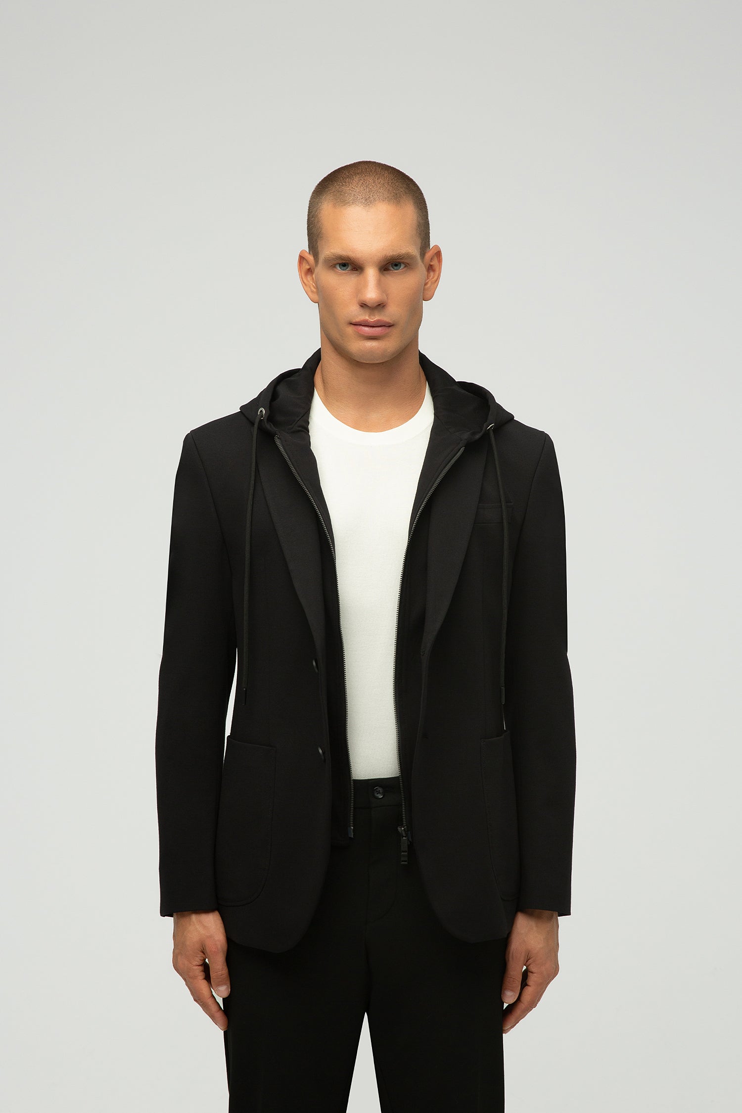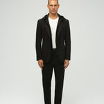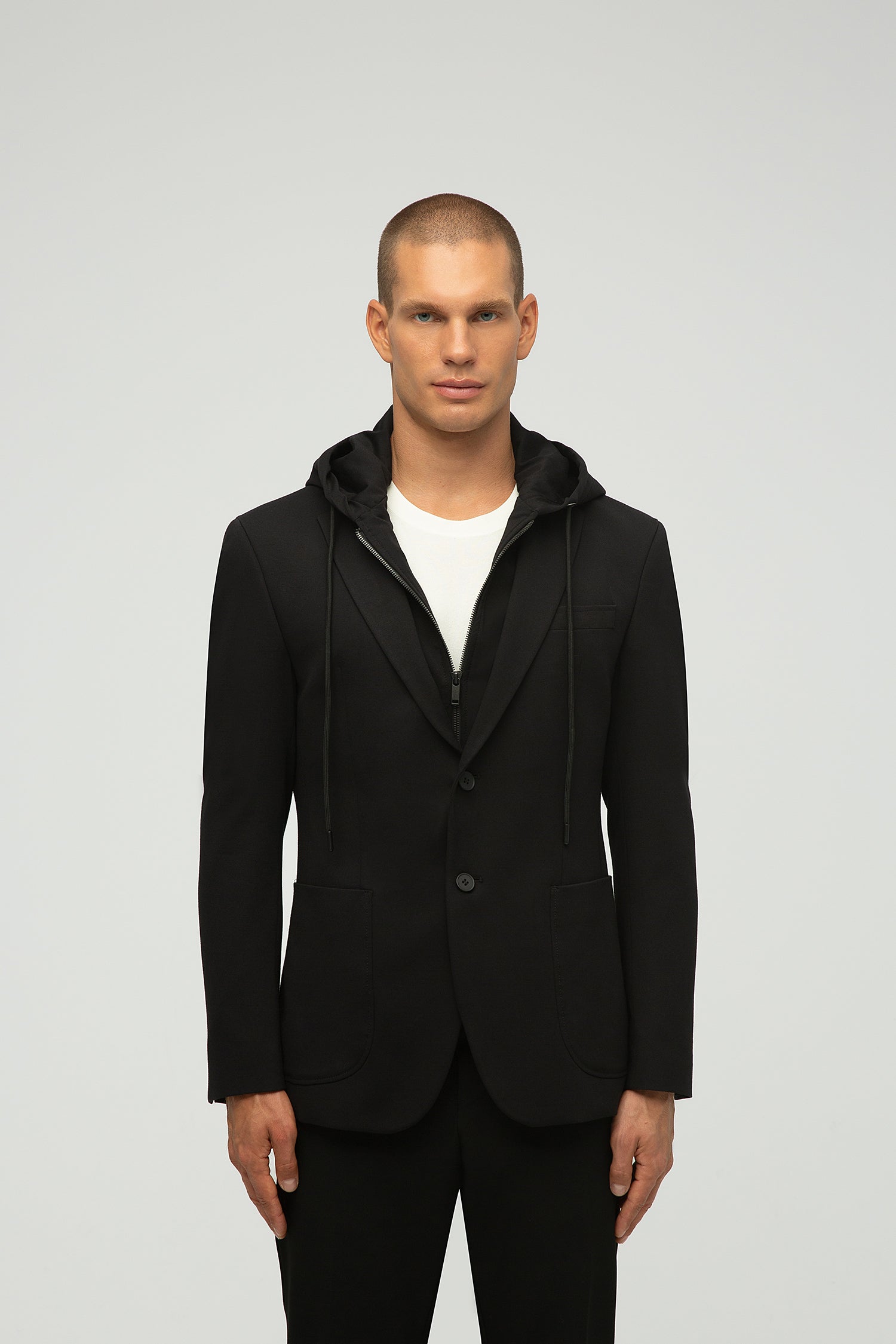 Hem işlevsellik hem de stil talep eden modern bireyler için tasarlanan bu blazer, olağanüstü konfor, esneklik ve dayanıklılık sunar. Tam astarlı ve streç astarlı olup, soğuk havalar için ideal bir mont işlevi görür. Fermuarla çıkarılabilen kapüşonu sayesinde sportif ve gündelik bir parçadan zarif bir blazera dönüşür. Resmi, gündelik ve etkinlik ortamları için ideal olan tasarım, göğüs kısmında bir mendil cebi, iki yan cep ve sportif şıklık görünümü için gaze dikişler içerir.