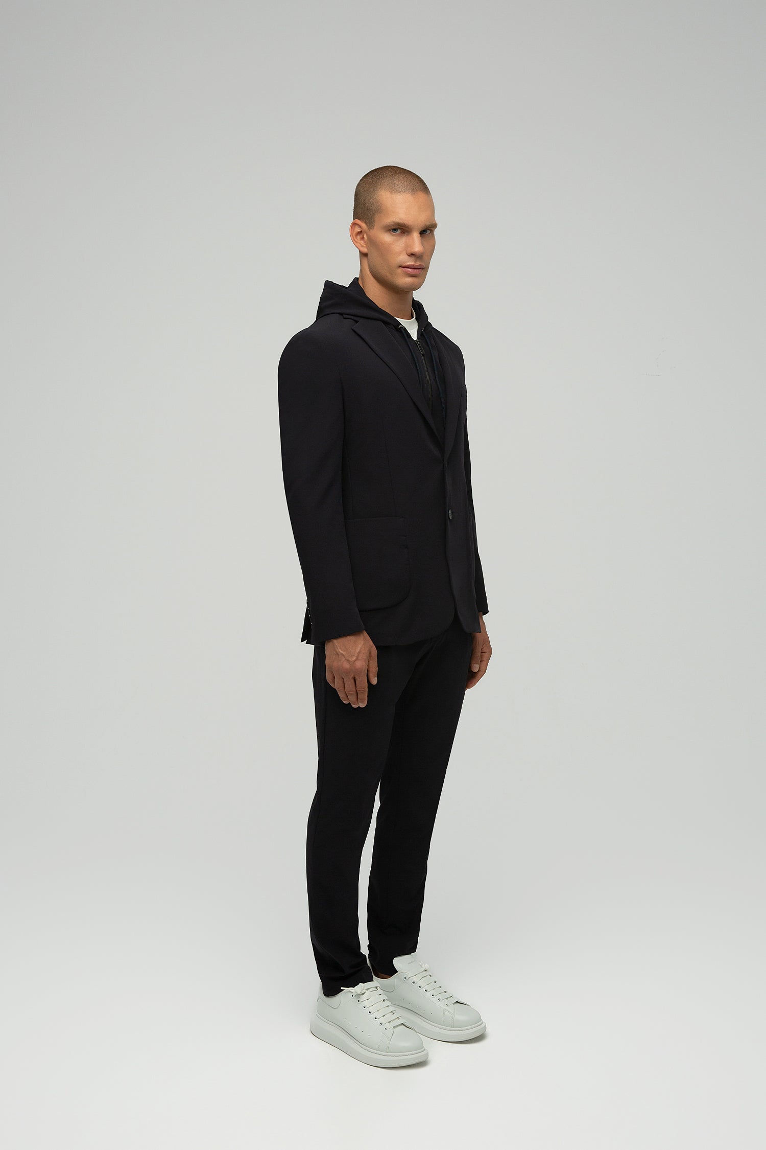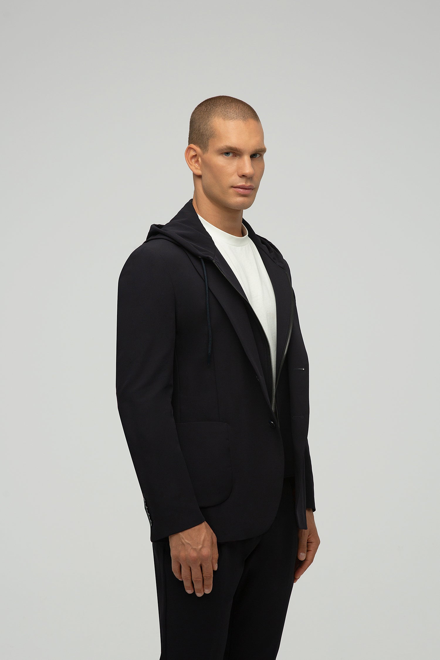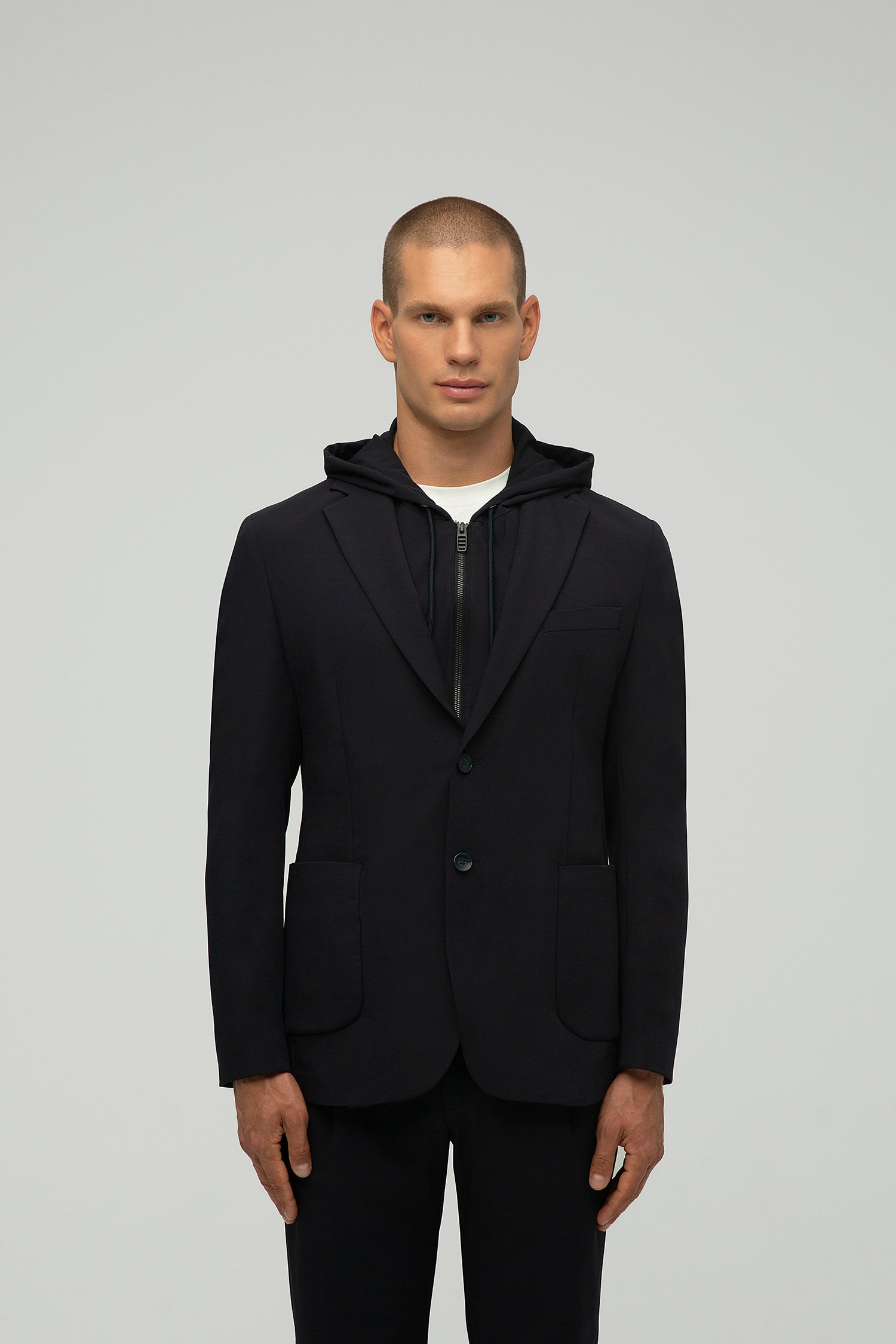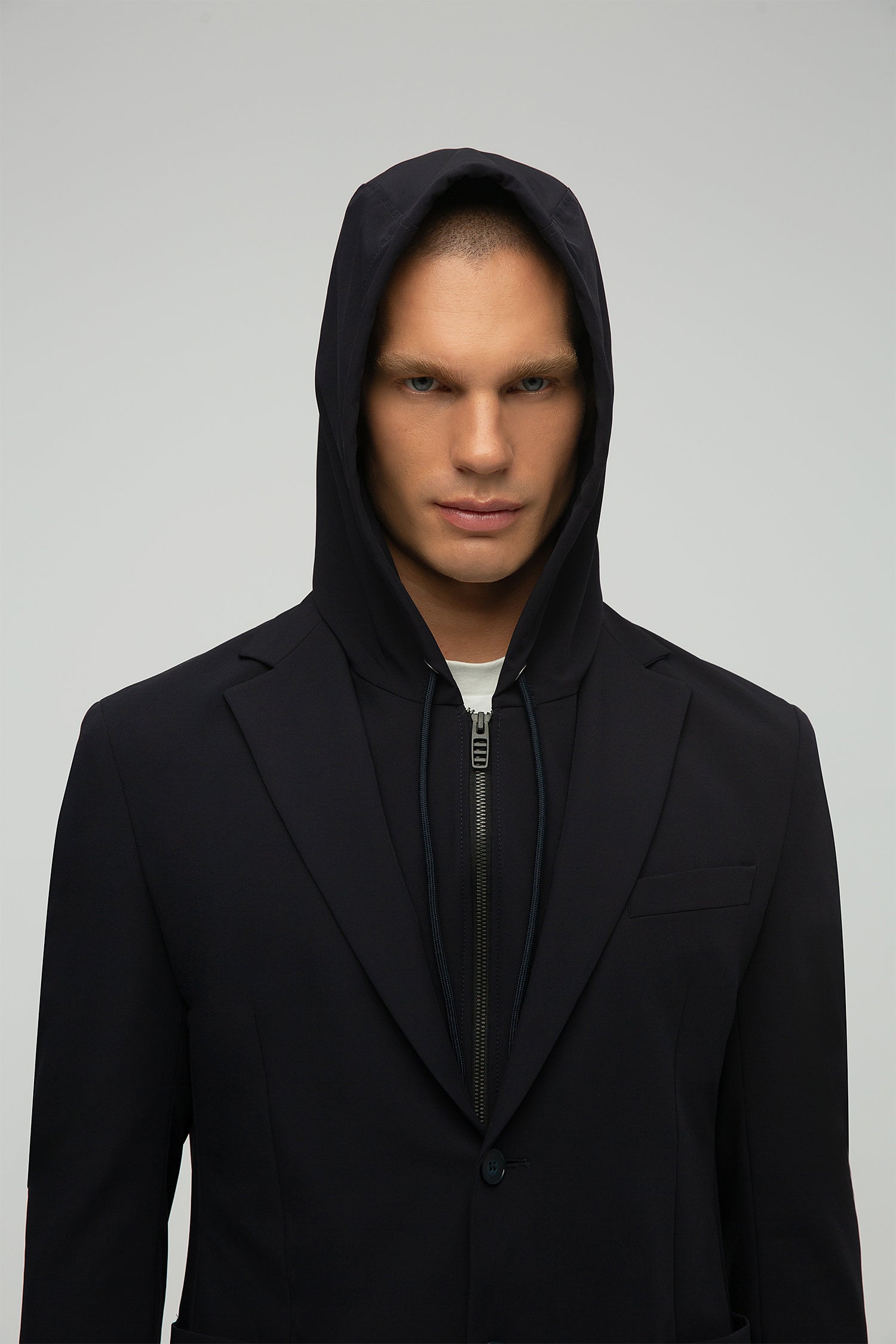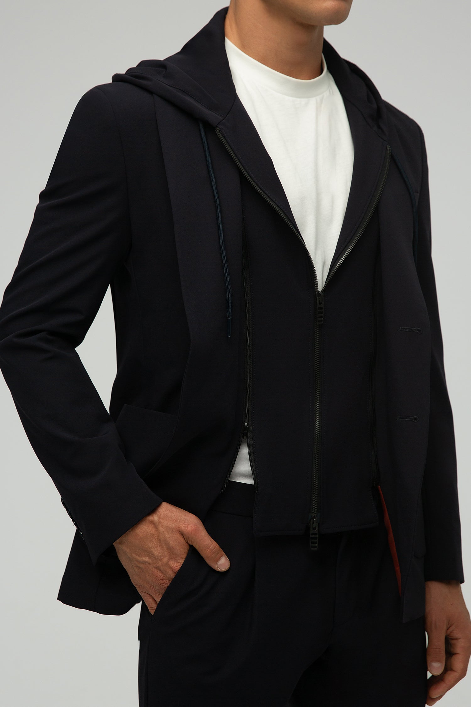 Modern bireylerin hem işlevsellik hem de stil taleplerini karşılamak üzere tasarlanan bu çok yönlü ceket, fermuarla çıkarılabilen kapüşonu sayesinde sportif ve gündelik bir parçadan zarif ve şık bir blazer cekete dönüşüyor. Kırışıklık karşıtı teknik kumaş ve punto dikişlerle tasarlanmış olup, olağanüstü konfor, esneklik ve dayanıklılık sunar. Yarım astarı, form ve hareket özgürlüğü arasında mükemmel bir denge sağlar.