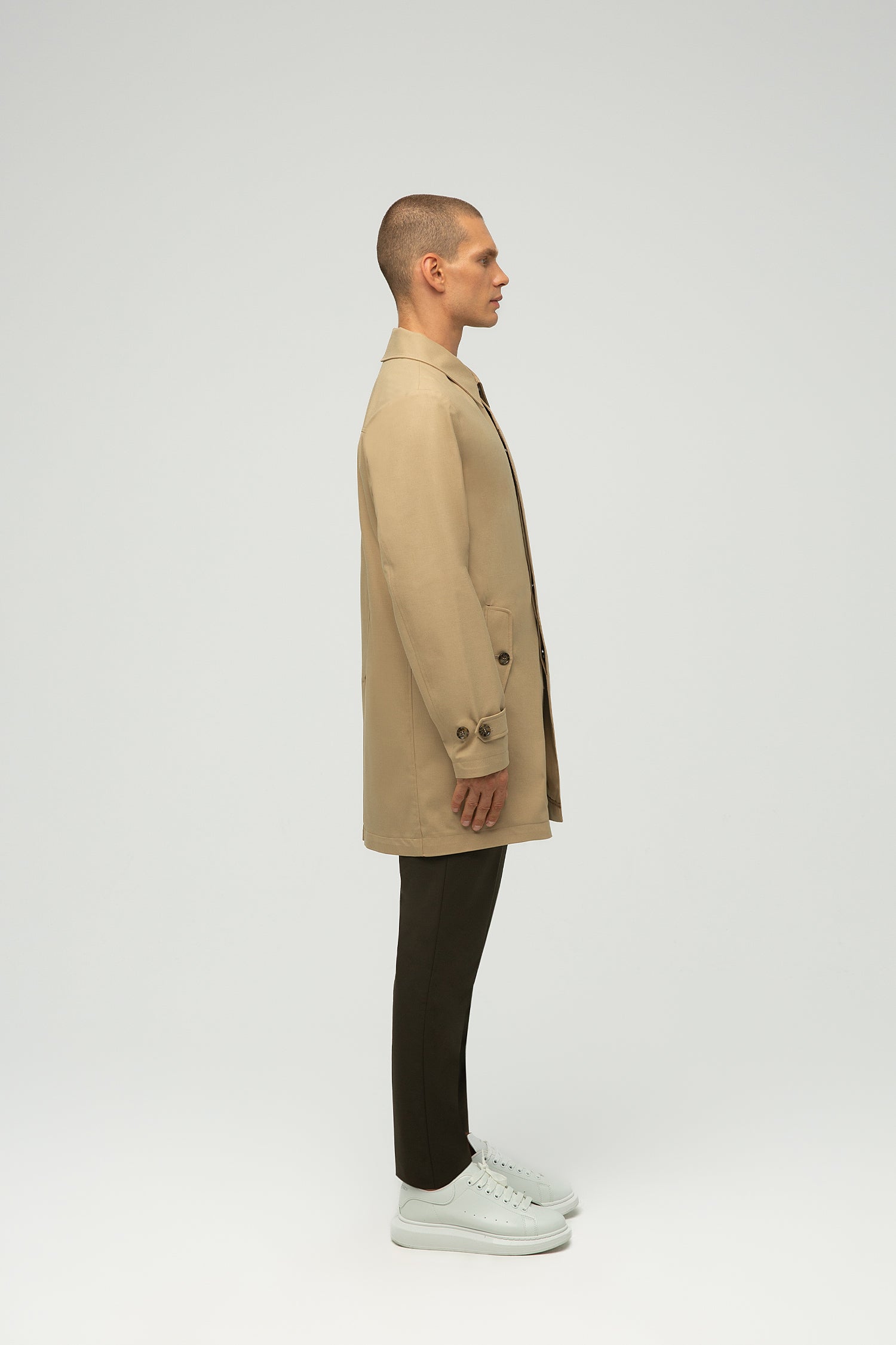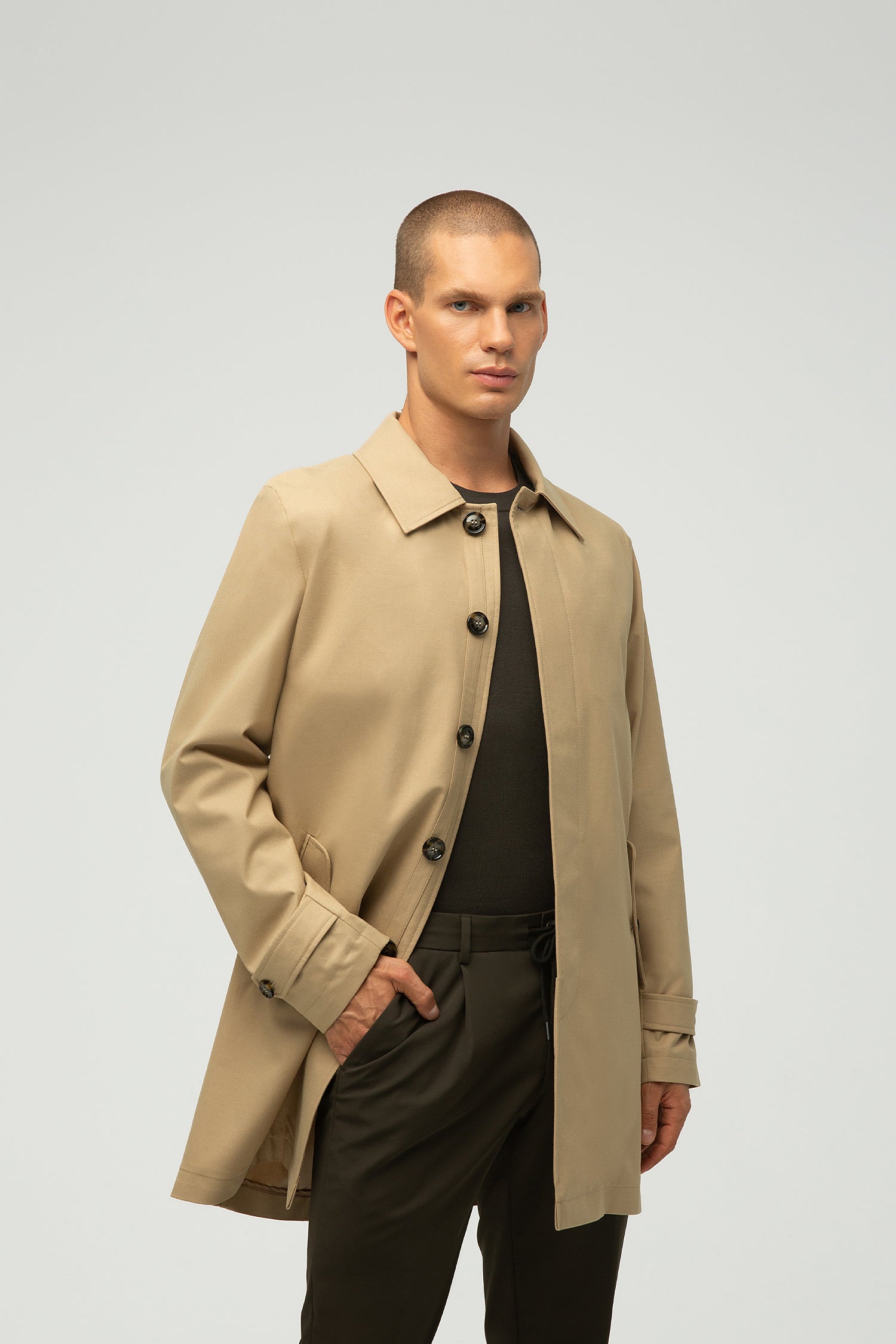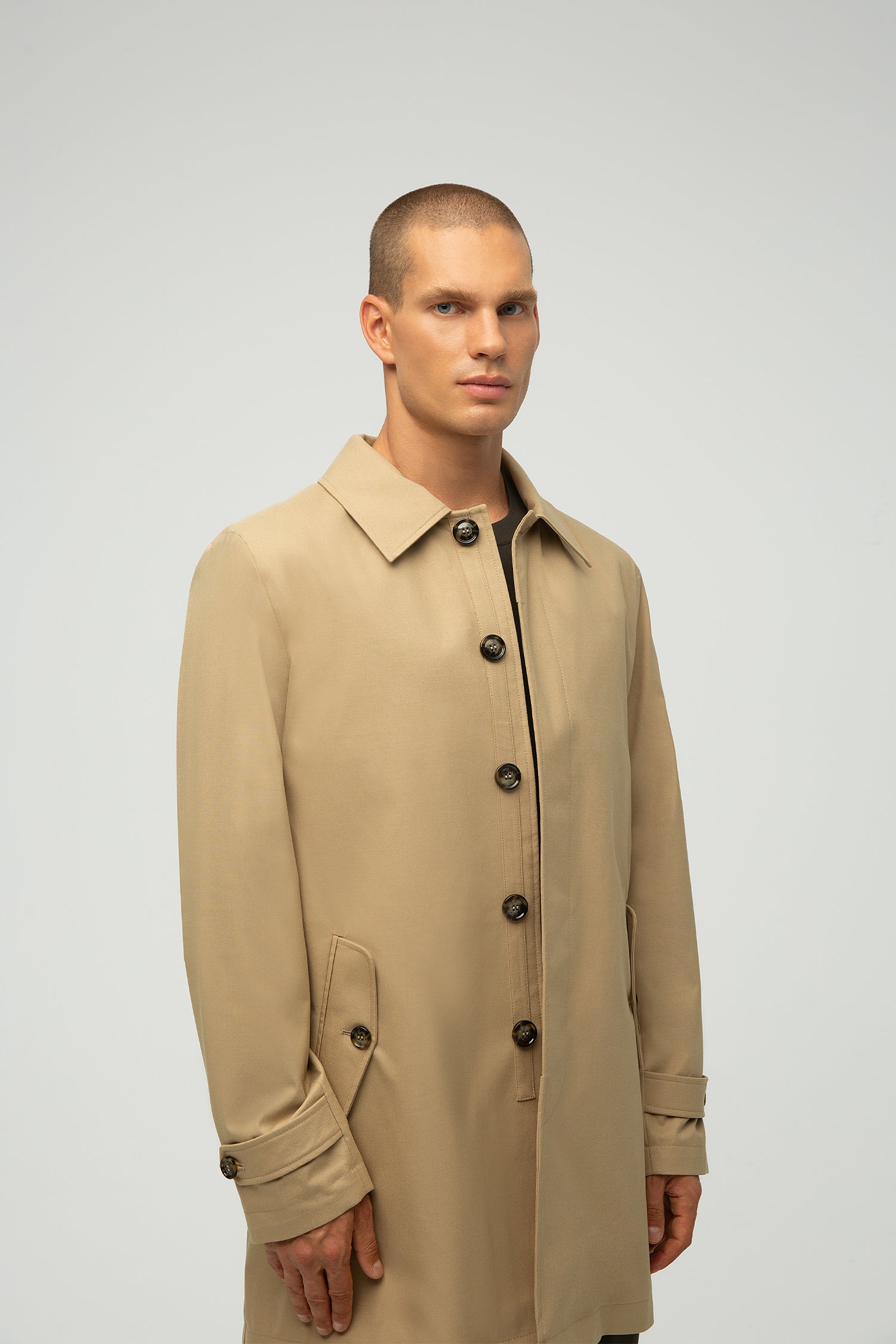 Şık tasarımıyla kısa trençkot, üstün teknik kumaş karışımından üretilmiştir ve olağanüstü konfor, esneklik ve dayanıklılık sunar. Su itici özelliklere sahip olarak tasarlanmıştır. Klasik bir görünüm için tam düğmeli kapanış, düğmeli manşetler ve eğik kapaklı cepler ile donatılmıştır. Hareket kolaylığı sağlayan üst üste binen arka yırtmaç içerir. Zamansız stil ile modern işlevselliği birleştirerek hem gündelik geziler hem de resmi davetler için mükemmeldir.
