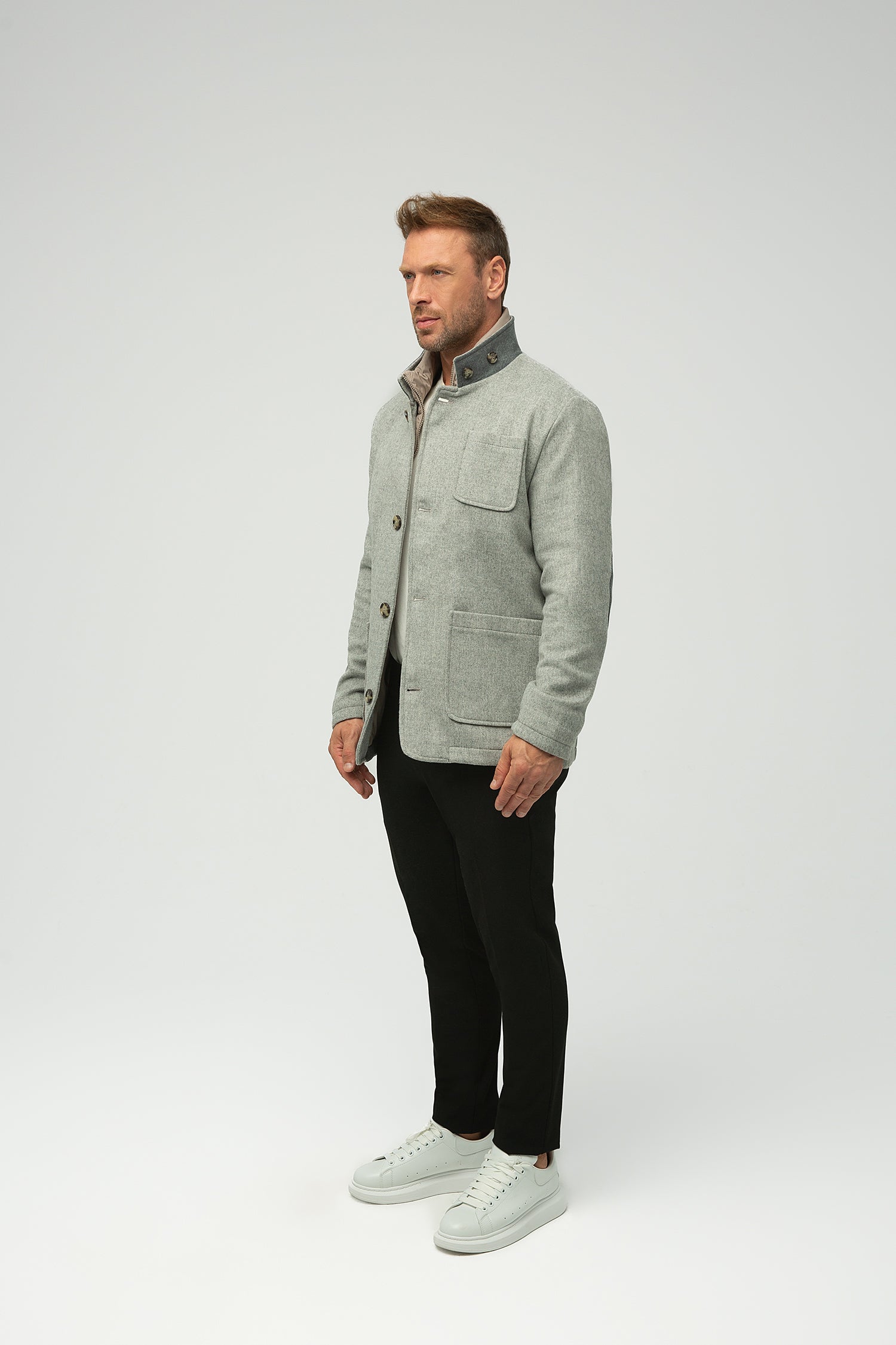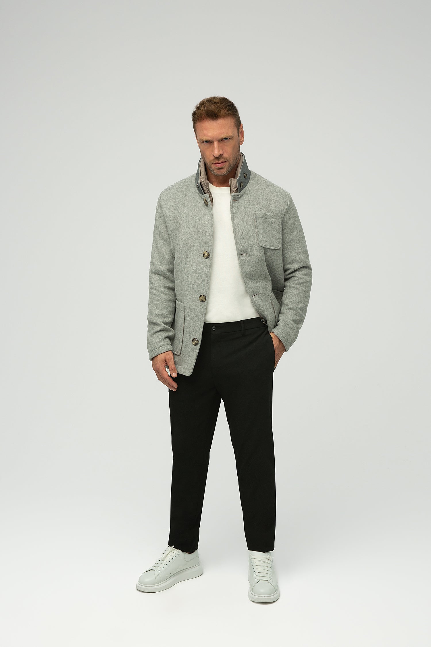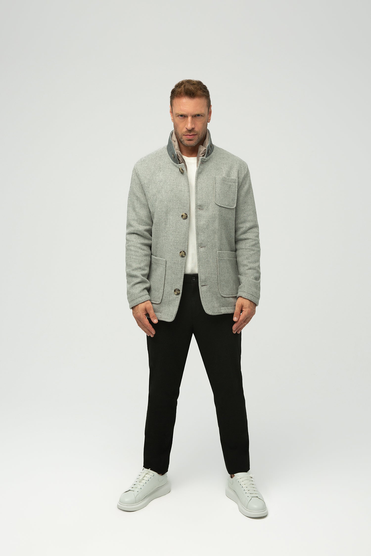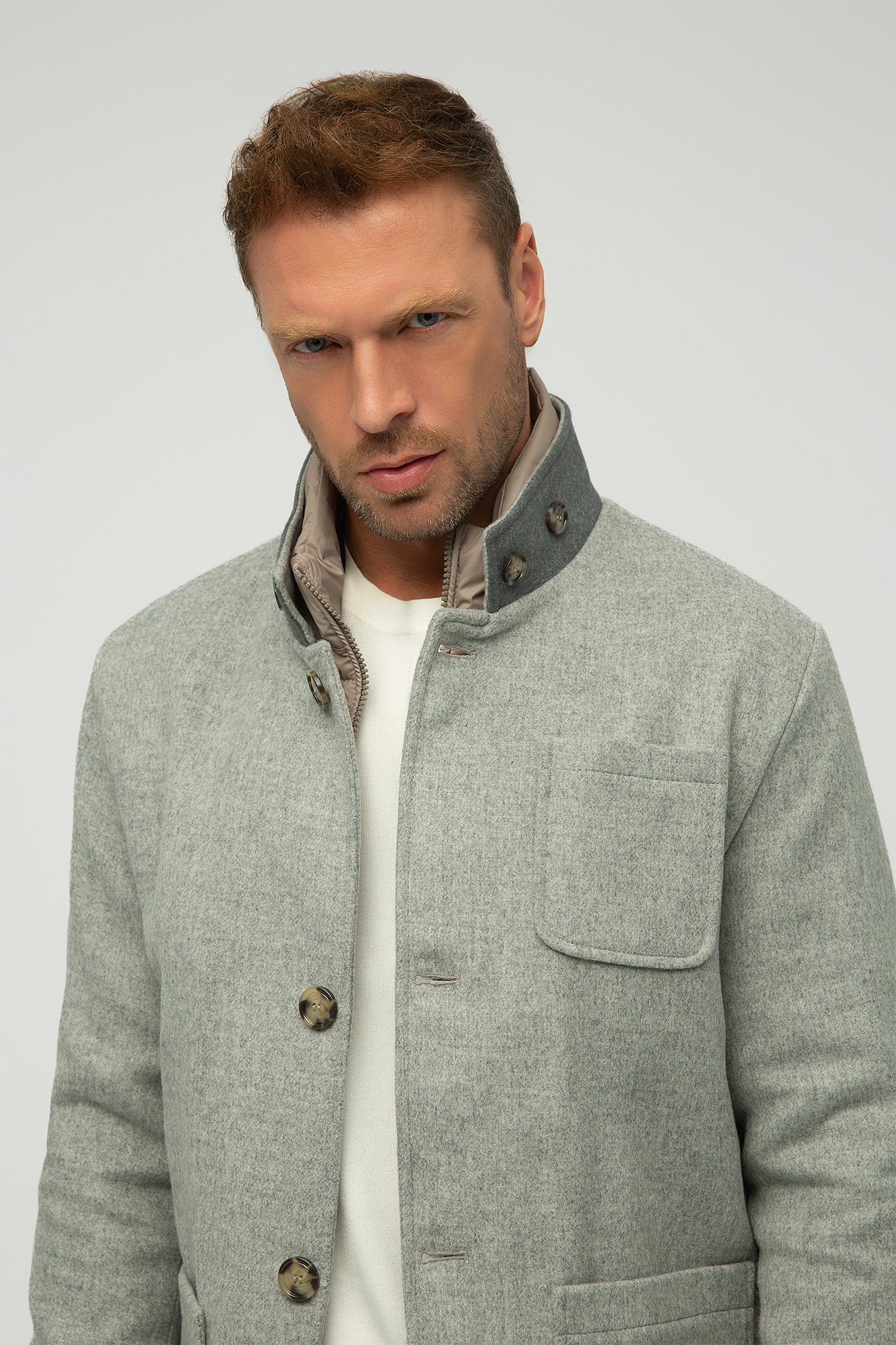 Düğme detaylı yüksek dik yaka