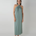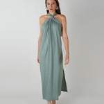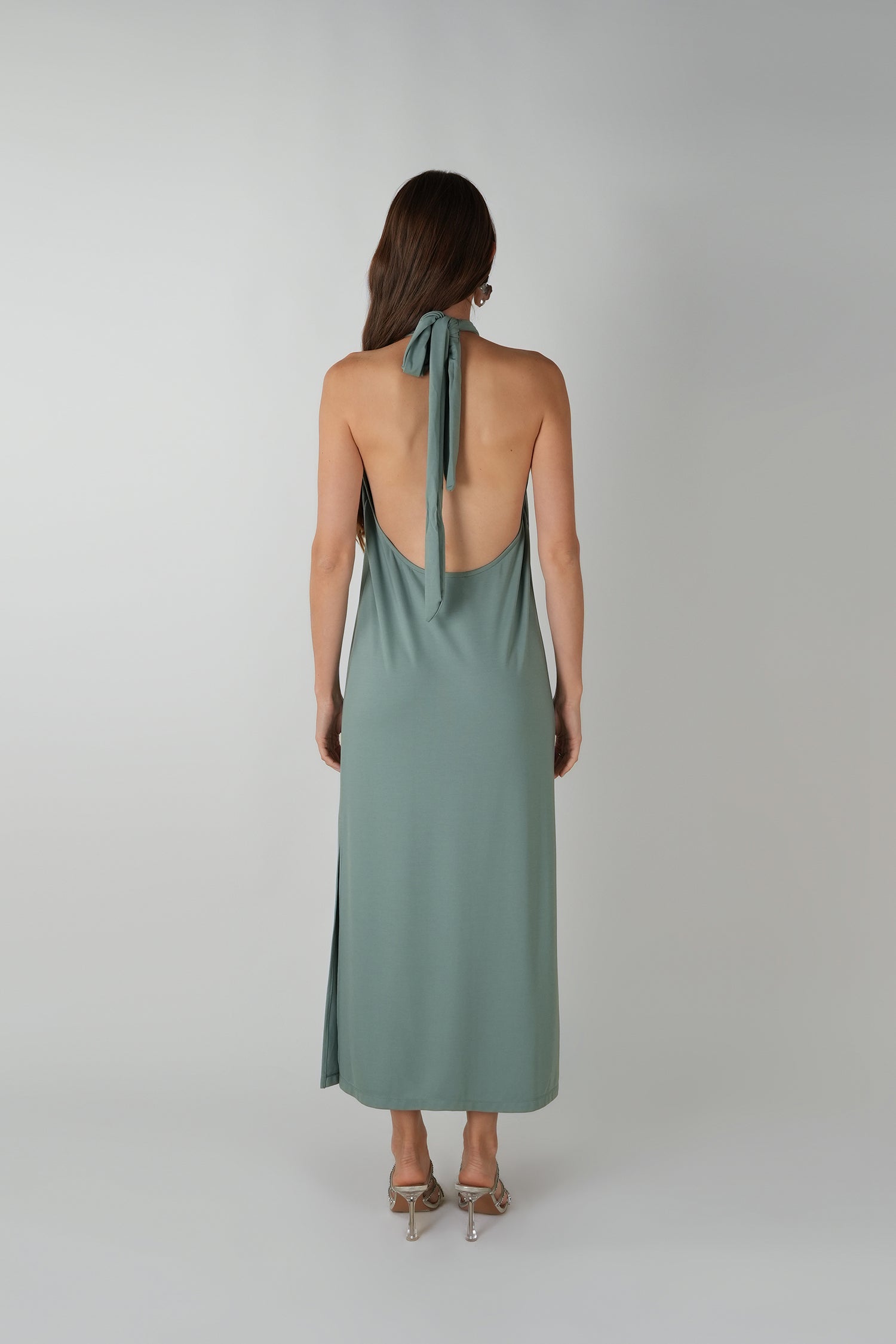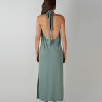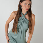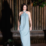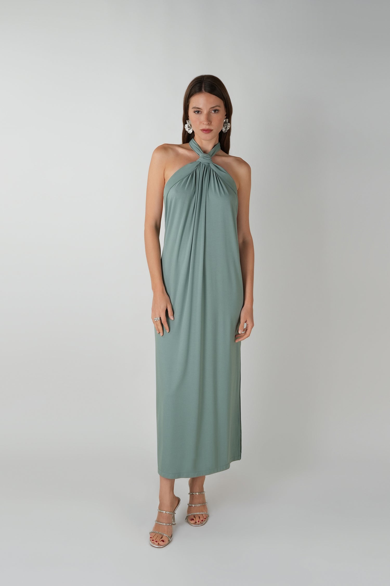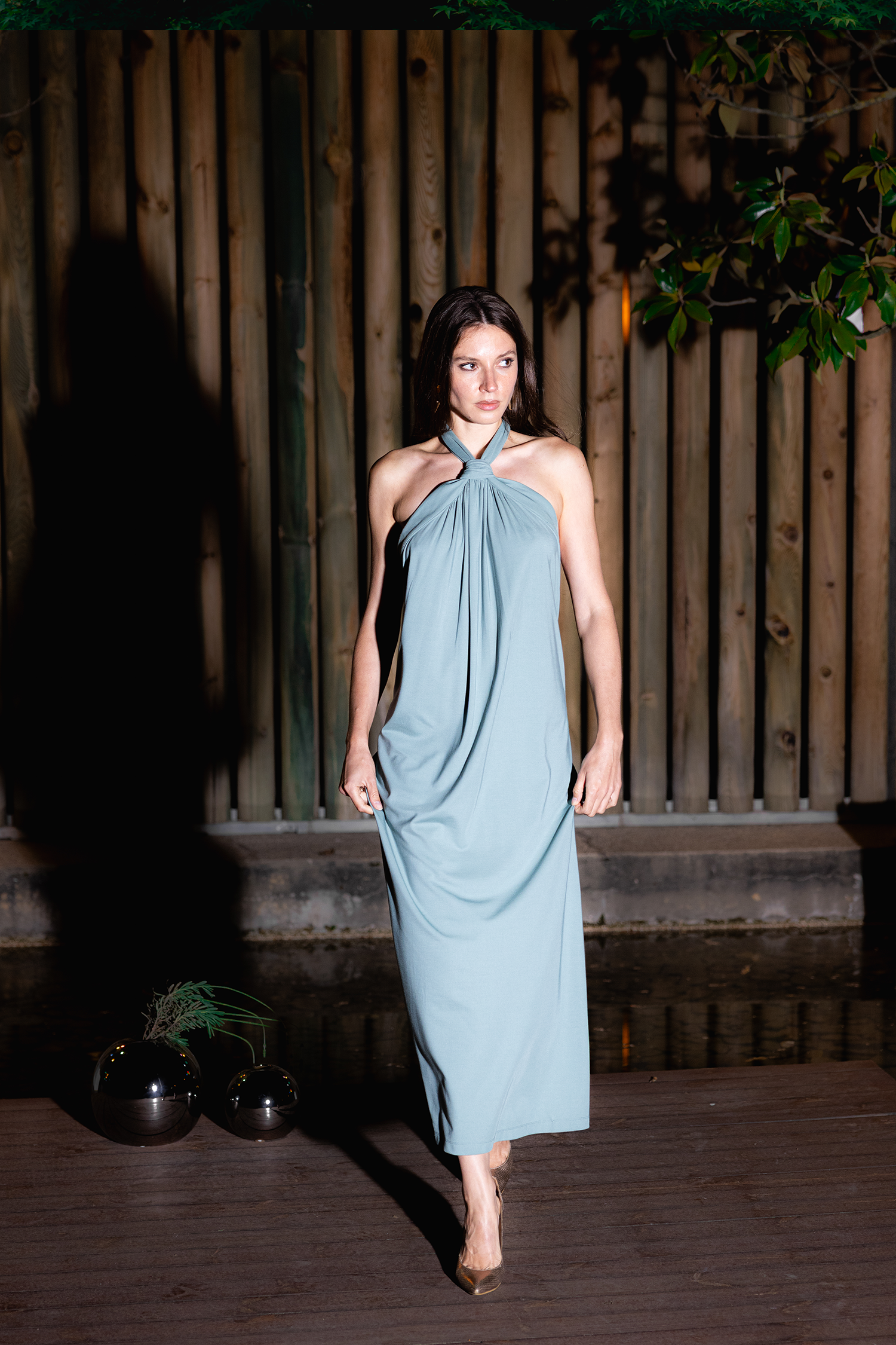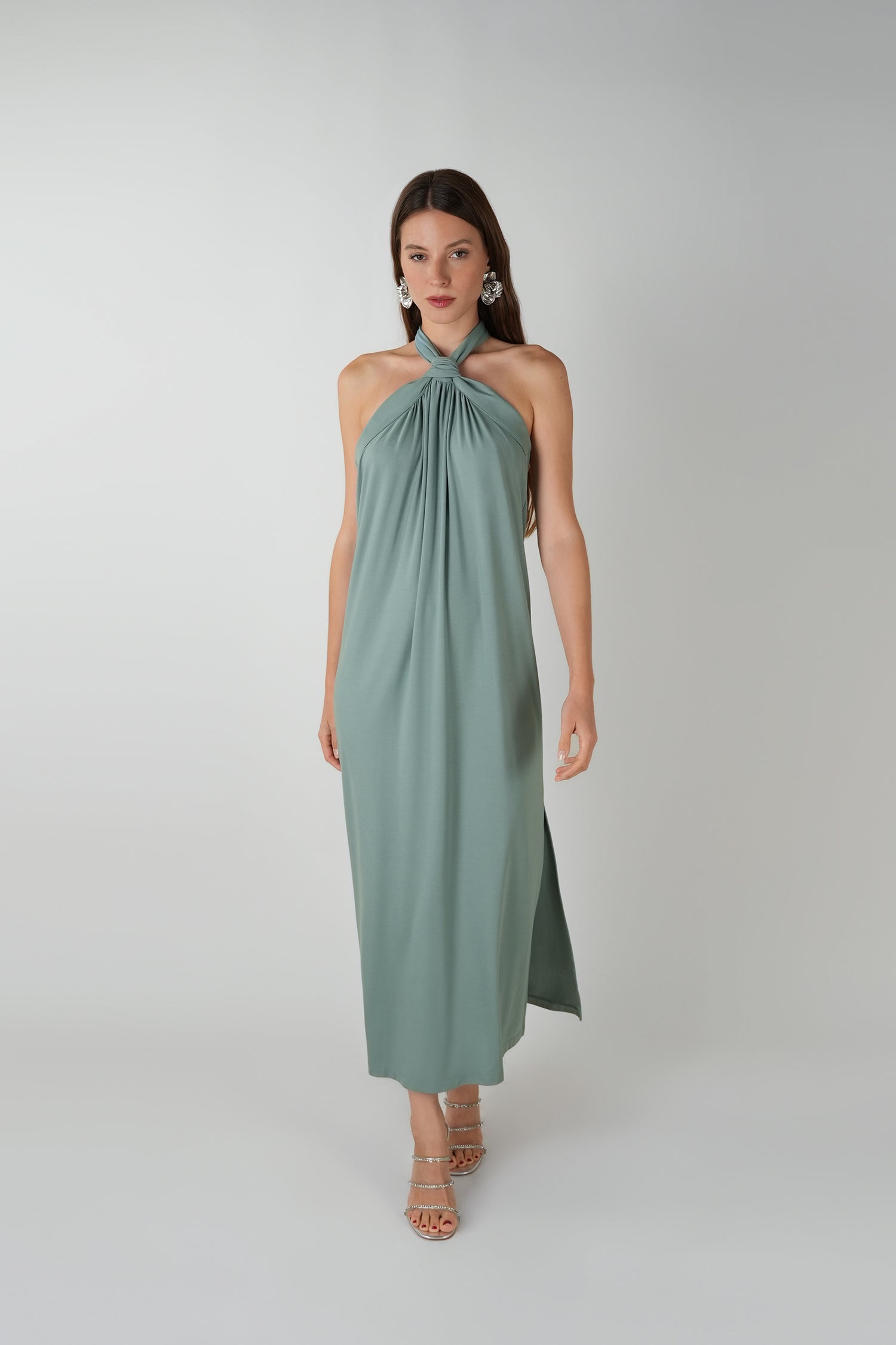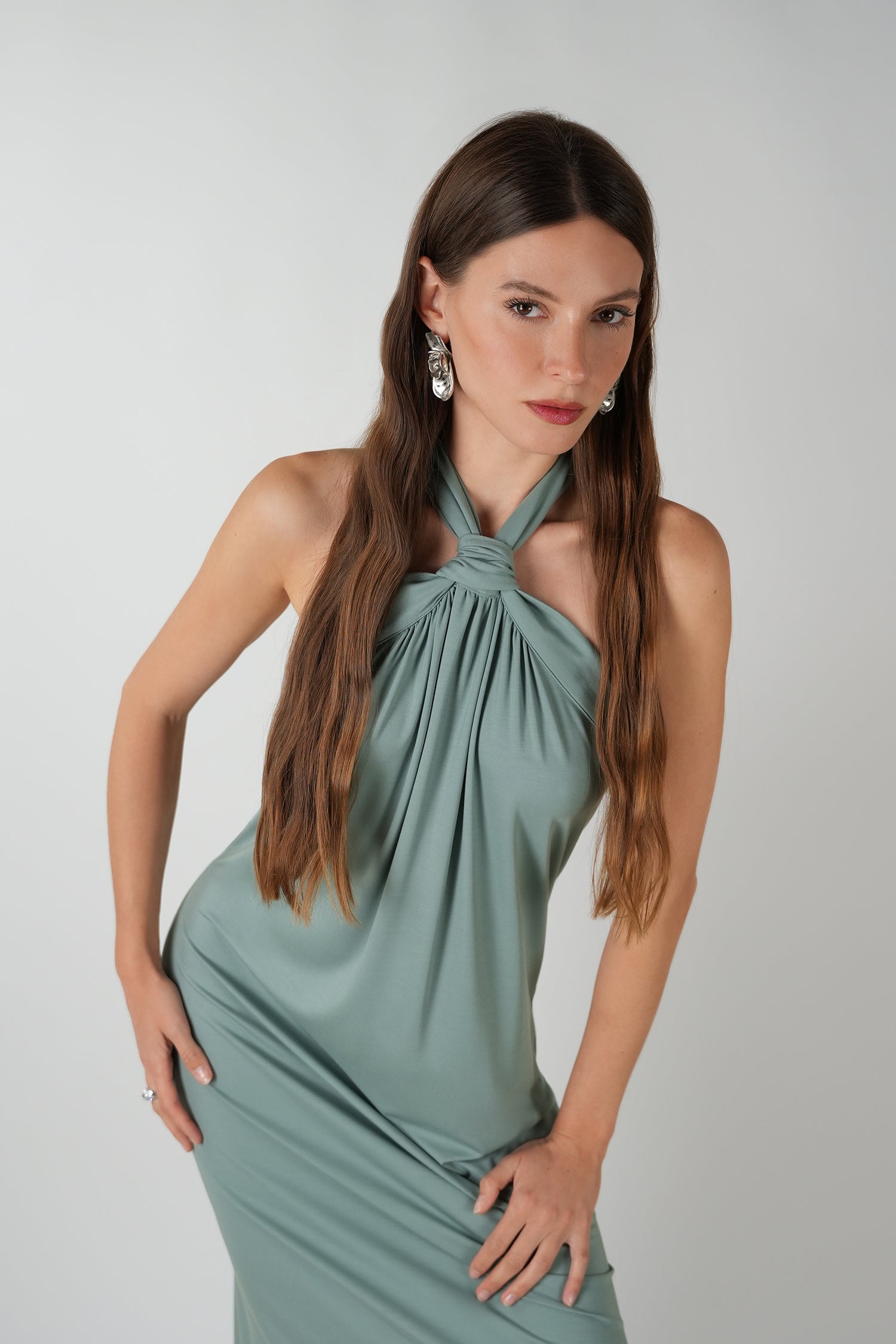 Ultra hafif ve dökümlü kumaşı sayesinde teninizde neredeyse yokmuş hissi yaratır. Boyundan düğümlü tasarımıyla güçlü bir siluet sunarken, sırt dekoltesi ve yırtmaç detayı feminenliği vurgular. Ayarlanabilir bağlama yapısı sayesinde vücuda mükemmel oturur ve gün boyu konfor sağlar. Geceden davetlere, yaz akşamlarından özel anlara kadar çok yönlü bir şıklık sunar.