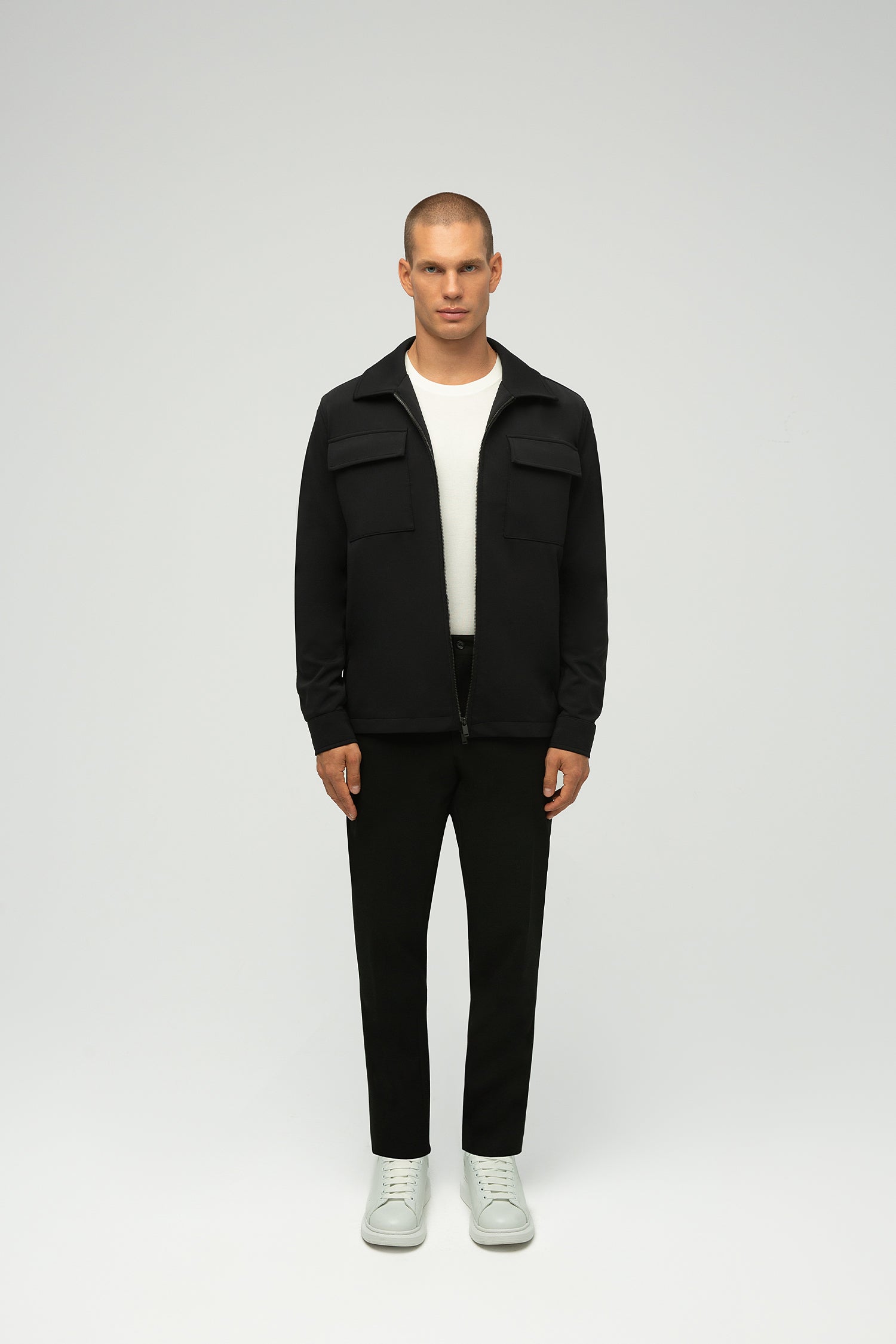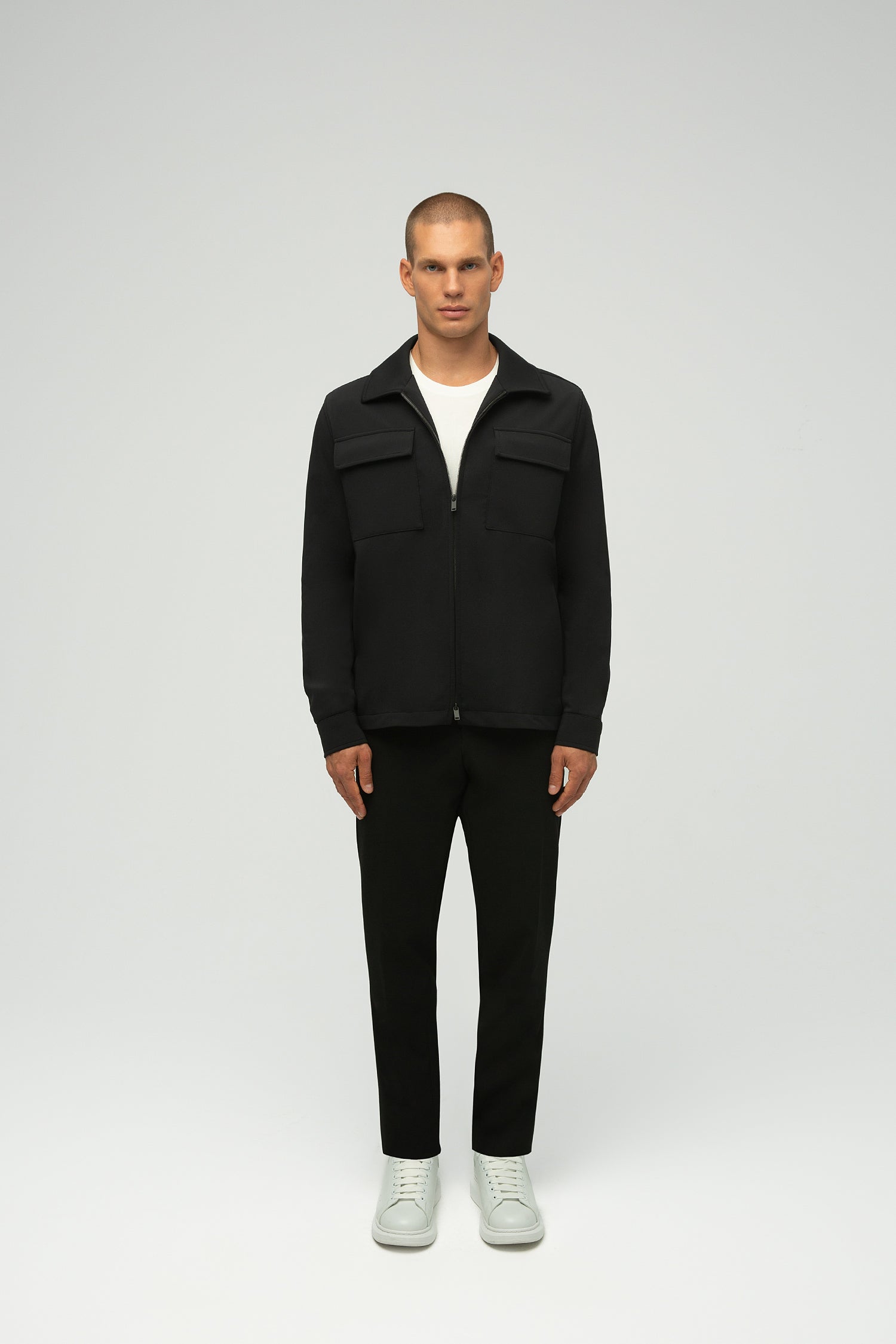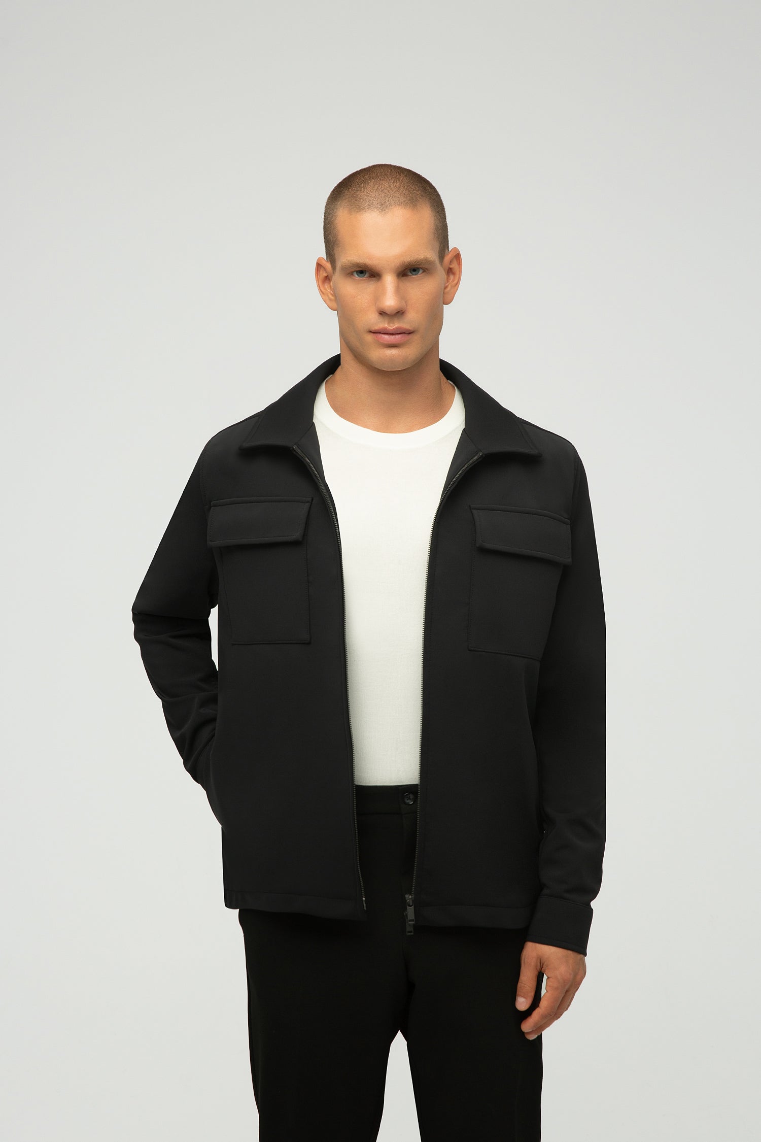 Designed from technical fabric, provides crease resistance and flexibility for everyday wear. Featuring a sleek design with a full zip closure and dual zipper pulls for versatile styling and ease of wear. Two large chest pockets with flaps and hidden side pockets provide ample storage space, while the collar adds a touch of sophistication. The stretch pongee lining ensures additional flexibility and comfort.